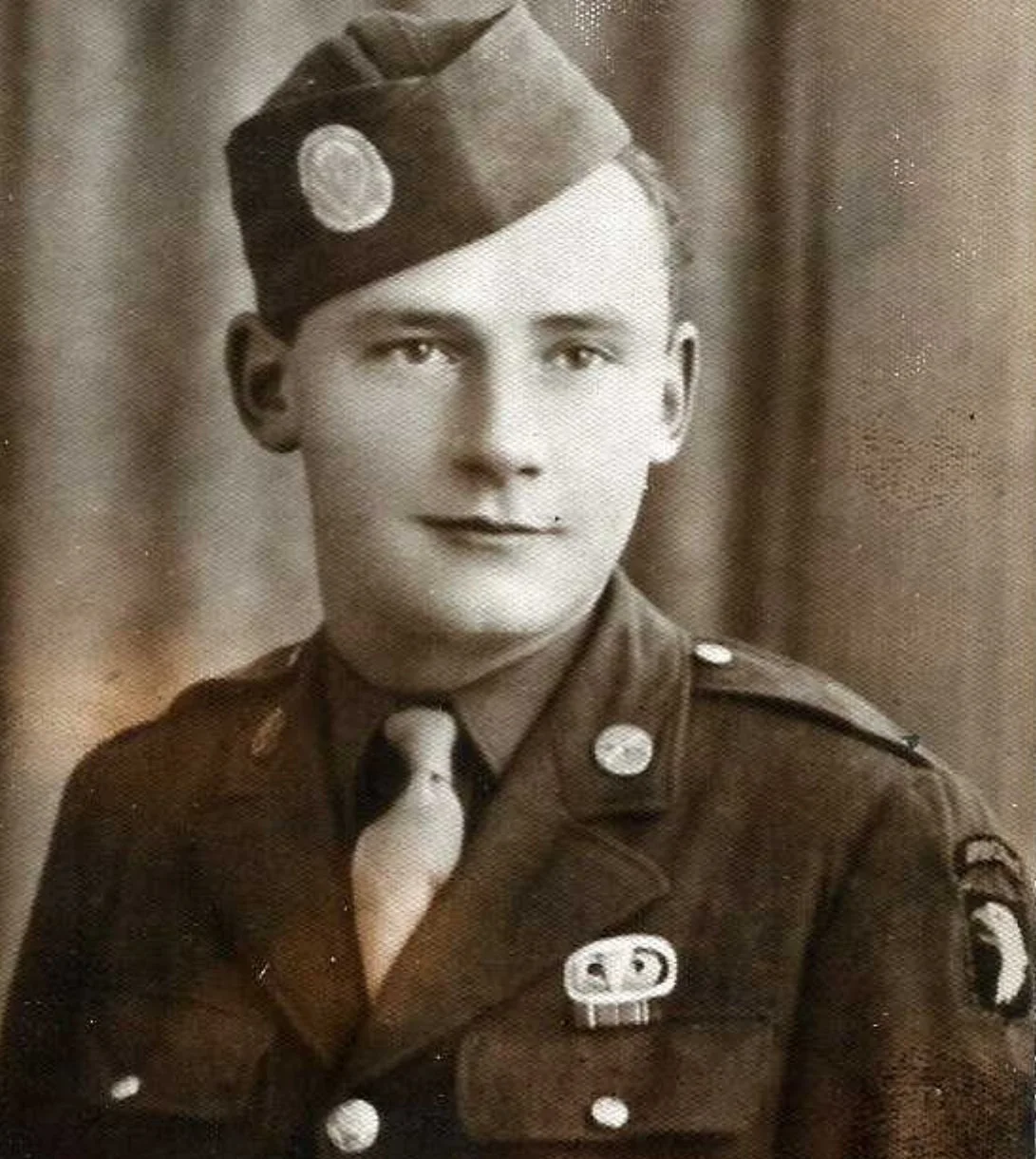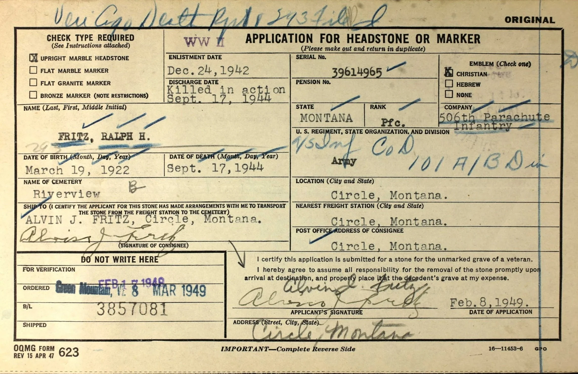 Private First Class (PFC) Ralph Henry Carl Fritz of Dog Company, 2nd Battalion, 506th Parachute Infantry Regiment (PIR), 101st Airborne Division, was born in Circle, McCone County, Montana, to Alvin J. and Elsie S. (Volpp) Fritz on March 19, 1922. Ralph was their oldest son. He had eight brothers, Howard J., Avron A., Lawrence W., Richard F., Winfred A., Arthur M, Lyle D, and Earl Fritz, and three sisters, Mildred R., Lucille S., and Gladys M. Fritz.