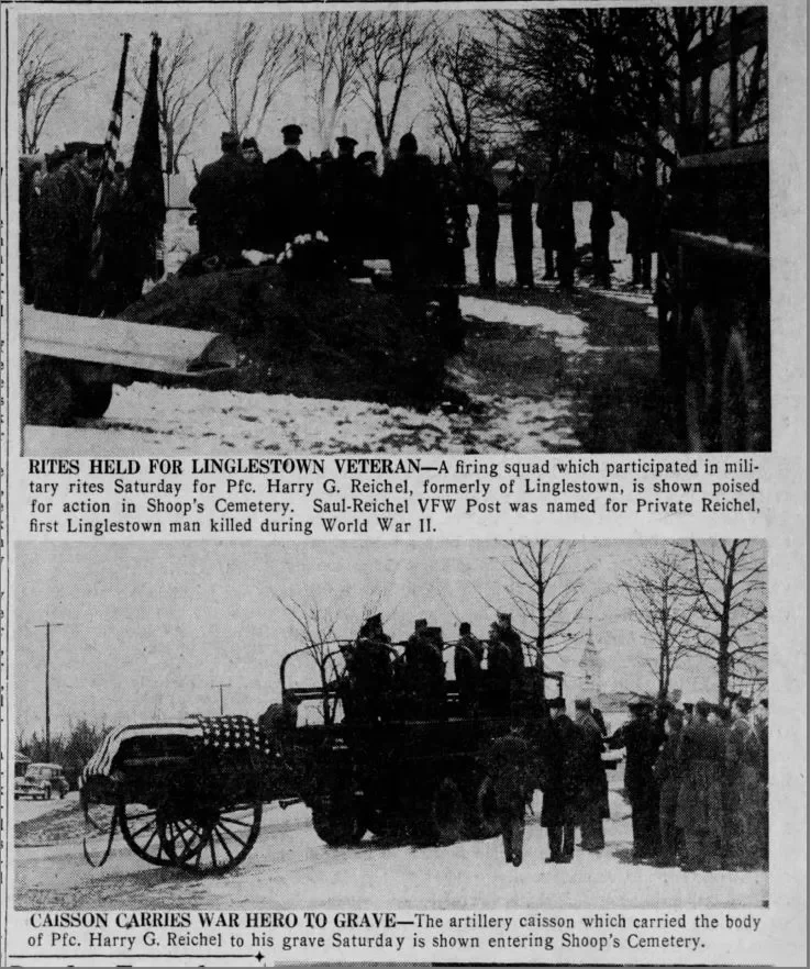 PVT Harry Reichel died of a gunshot wound to his chest at age 27, on January 3, 1945.