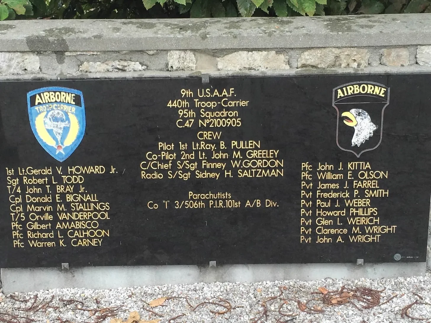 PVT Paul Weber was onboard a C-47A Skytrain, #42-100905, an aircraft belonging to the 95th Troop Carrier Squadron of the 440th Troop Carrier Group. The pilot was 1LT Ray B. Pullen, and the jump master was 1LT Gerald V. Howard Jr. The plane carried a mixture of men from Item Company’s 1st Platoon and several paratroopers from its HQ Section.